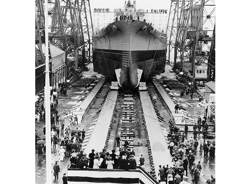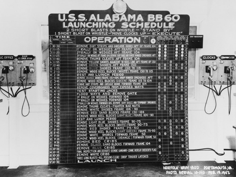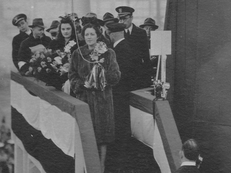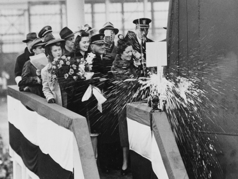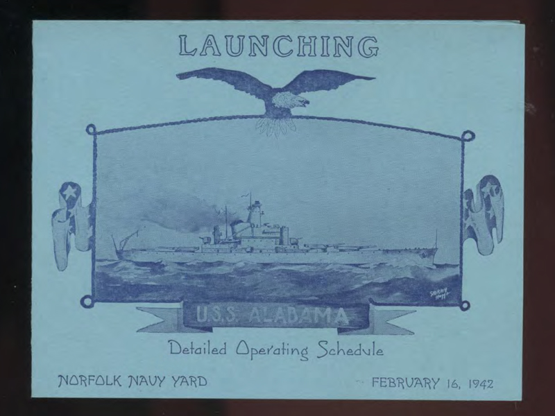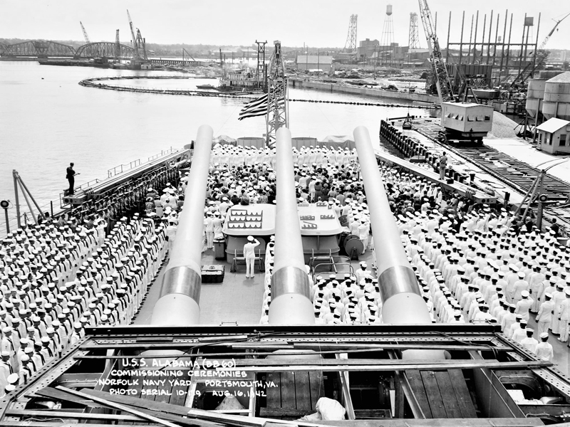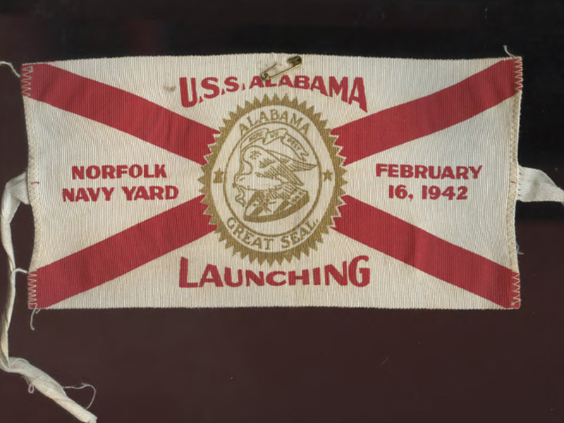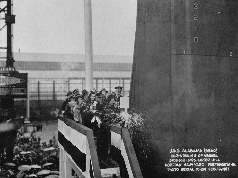 Henrietta McCormick Hill, the wife of U.S. Sen. Lister Hill, christened the USS Alabama with a bottle of champagne before the ship launched from Norfolk Navy Yard in Portsmouth, Virginia. The sixth ship named after the state of Alabama by the U.S. Navy, the 680-foot-long Alabama displaced 35,000 tons of water and carried 129 guns. The ship served in the Atlantic and Pacific theaters during World War II as it voyaged 218,000 miles, shot down 22 enemy aircraft and earned 9 Battle Stars for action that included the “Great Marianas Turkey Shoot” and the invasion of Saipan.