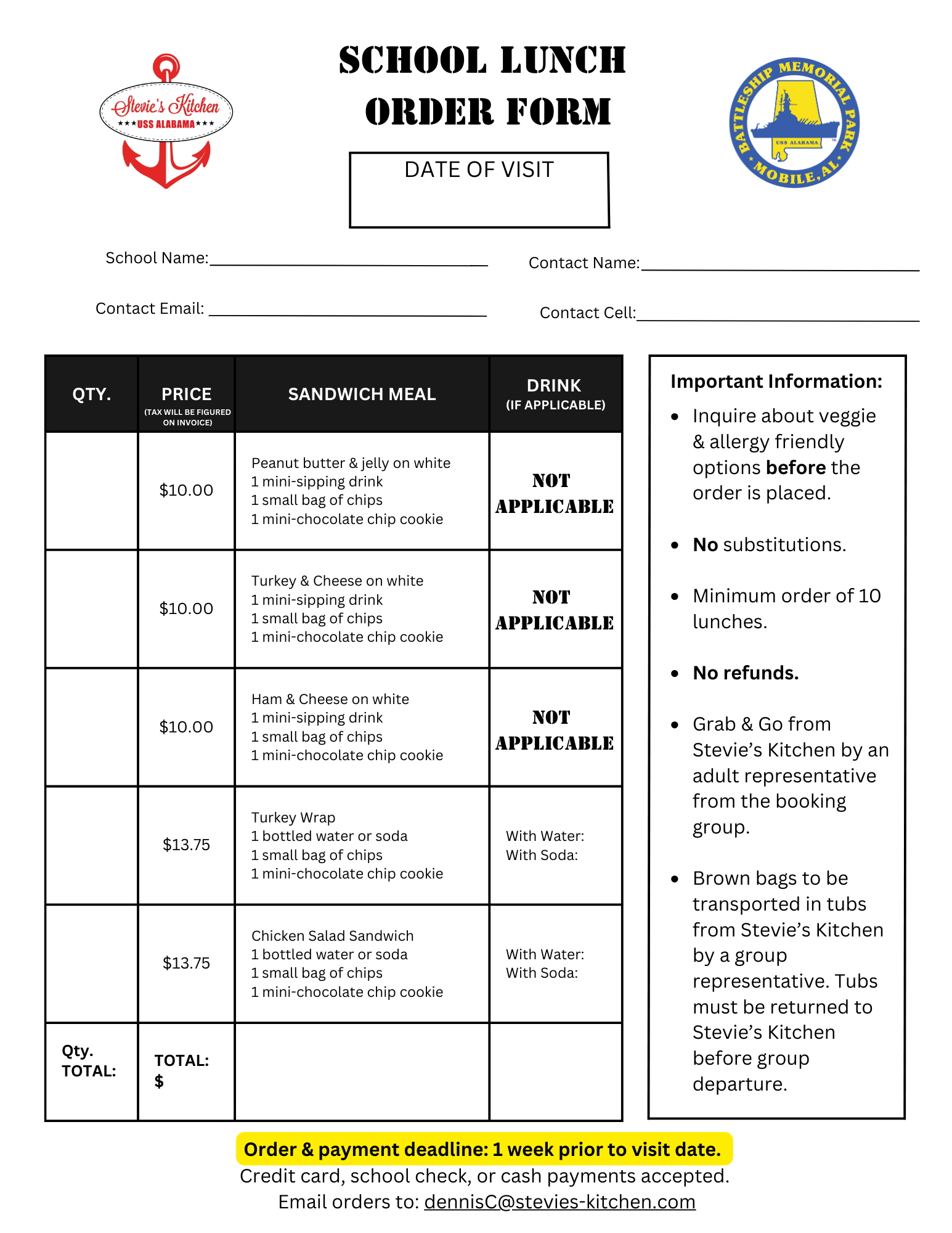USS ALABAMA Battleship Memorial Park does not offer lunch options. Groups are encouraged to pack picnic lunches and enjoy use of the park picnic pavilions overlooking the Battleship USS Alabama. To ensure the best experience for all visitors, we kindly ask that teachers who wish to utilize our picnic tables for their groups request a time slot in advance. This helps us manage the availability of the tables and ensures that everyone can enjoy their time at USS ALABAMA Battleship Memorial Park.