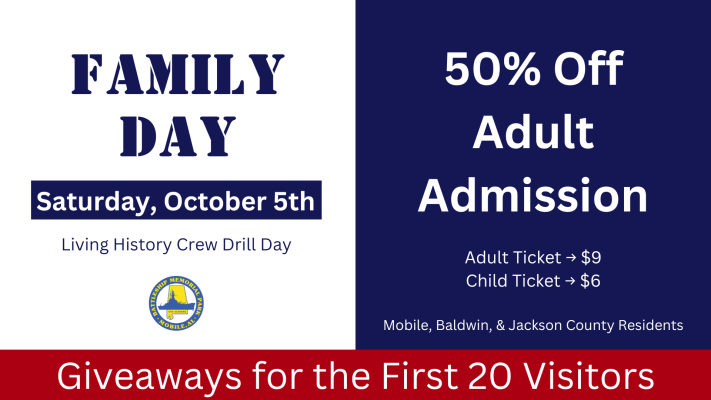 Step back in time with our WWII reenactors during the October Living History Crew Drill at USS ALABAMA Battleship Memorial Park’s first ever Family Day! Residents of Mobile, Baldwin, and Jackson Counties enjoy 50% off adult admission with ID. Giveaways will be given to the first 20 visitors for the day. Parking fee applies: $5 for single vehicle and $30 for all RVs & 18 Wheelers. Join us for a day of living history with the whole family!